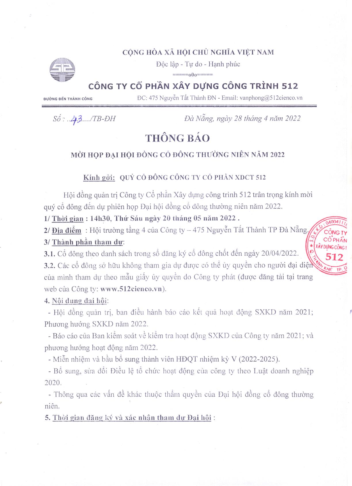 Hội đồng quản trị Công ty Cổ phần Xây dựng công trình 512 trân trọng kính mời quý cổ đông có đủ điều kiện đến